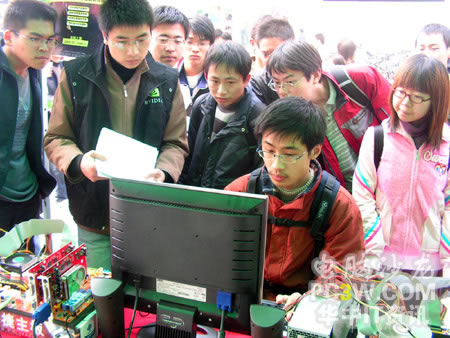 講座首先由商科集團(tuán)武漢分公司天行電腦的唐平安先生發(fā)言,他首先詳細(xì)的向大家解釋了銘瑄NVIDIA“三重威力”的定義。并就“三重威力”的具體內(nèi)容SM3.0、HDR以及SLI逐一做了詳細(xì)的說(shuō)明,并分析了未來(lái)顯卡的發(fā)展趨勢(shì)。他生動(dòng)詳細(xì)的演講讓在場(chǎng)的同學(xué)們聽(tīng)得聚精會(huì)神,對(duì)其產(chǎn)品有著濃厚的興趣。