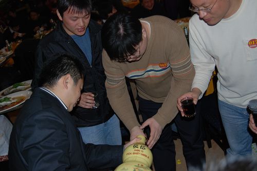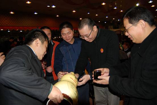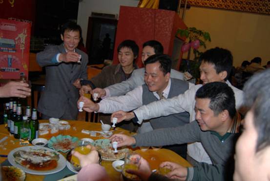 公司孫總為各位經理們倒酒,這酒瓶不是一般的大,喝下去也不是一般的勁啊!