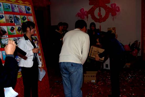 這位同事高興的接過價值599元的高檔化妝品及領導的祝福 。