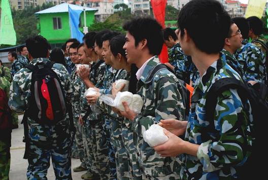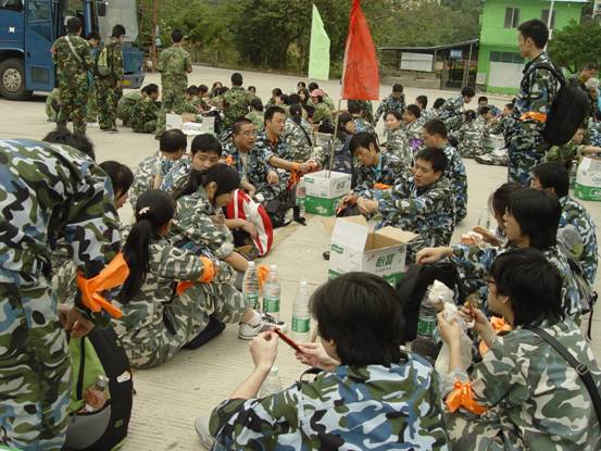 在做完熱身運動后,拓展活動也拉開了序幕。 既然是集體活動,集體的概念也是最基本的。在教練的帶領下,近200名商科同事劃分為7個小隊。教練給出15分鐘時間,要各小隊決定自己的隊名、口號、隊歌和隊伍造型。 二、別開生面的午餐 在進行了隊伍風采展示后,時間已經12點多了,現在該補充點能量了。今天的午餐是什么呢。沒有大魚大肉哦。