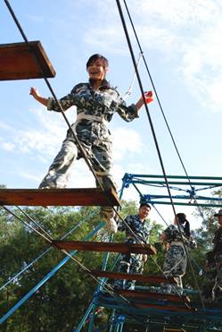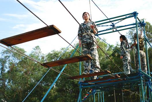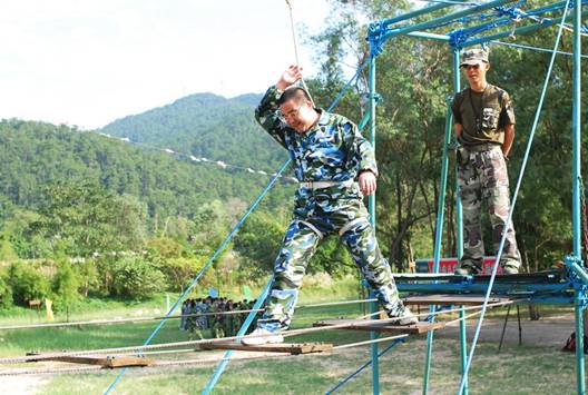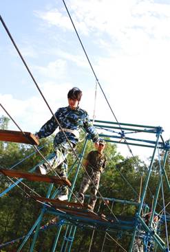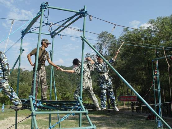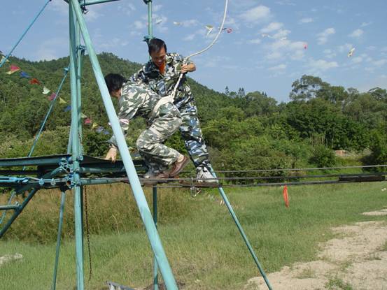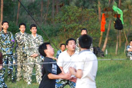 飛奪瀘定橋。這個項目是從高空的木板橋上通過,木板的間隙比較大?此坪唵危呛芏嗳苏旧先,雙腿就開始不由自由的哆嗦,這很能鍛煉人的勇氣哦。 這個項目讓許多人有一點害怕,但是當有的同事在上面感到恐懼的時候,下面的同事齊心協力的為他加油打氣,增加他的信心和勇氣。在大家的鼓勵下,同事們一一通過了這個項目。