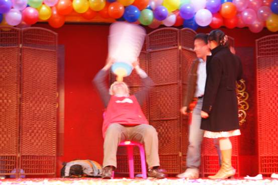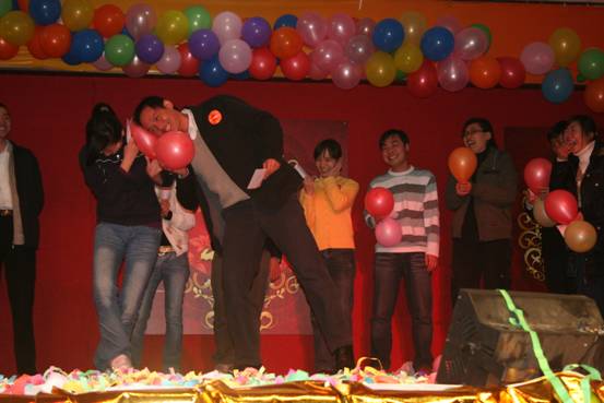 在精彩的文藝節(jié)目表演完后,是游戲時間了,首先是搞笑的頂氣球。