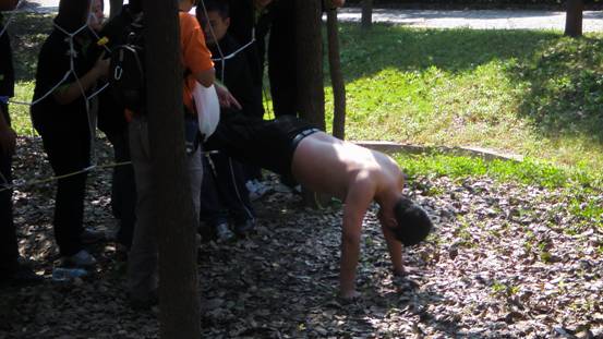 第二個(gè)是“人椅”。教練讓大家圍成圈,每個(gè)人的手都跨過一個(gè)人搭在前面人的肩膀上,然后一起坐在后面人的膝蓋上。開始所有人都覺得不可能完成的任務(wù),可當(dāng)我們下定決心,打破男女隔閡一起往下蹲時(shí)才發(fā)現(xiàn),這是件非常容易且不費(fèi)任何力氣的任務(wù)。原來,只要我們能夠緊緊團(tuán)結(jié)在一起,齊心協(xié)力,沒有什么完成不了的事情!