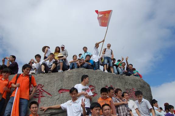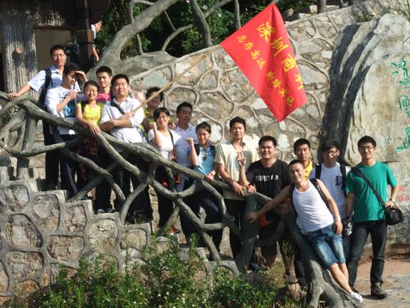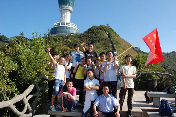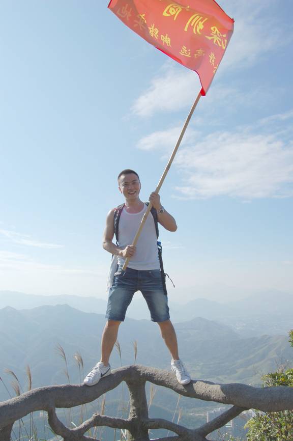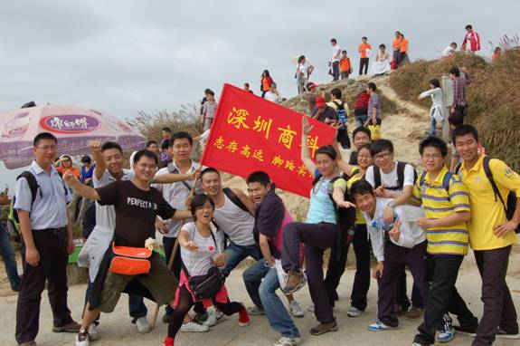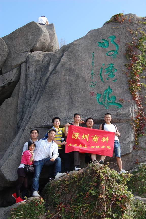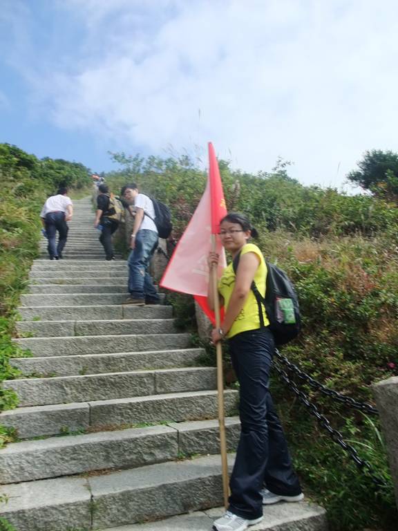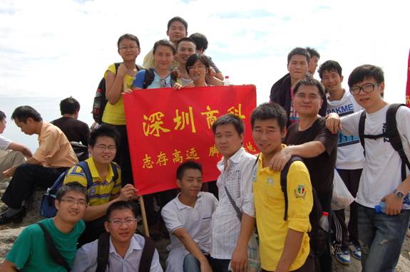 “深圳商科的紅旗在鵬程第一峰迎風(fēng)飄揚(yáng)----志存高遠(yuǎn),腳踏實(shí)地!” 歷盡千辛萬苦終于到了山頂,低頭看看那長長的臺階,心在跳,腿在抖,人到底還是上來了,“會當(dāng)凌絕頂,一覽眾山小”,看著遠(yuǎn)處的高樓大廈,有很強(qiáng)的成就感。