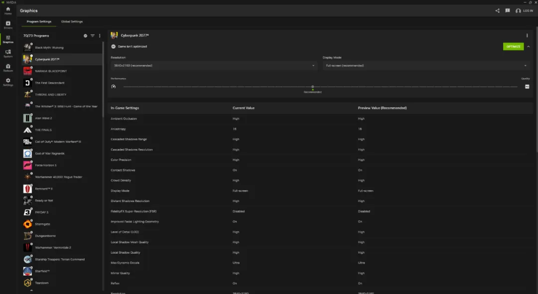 對于游戲玩家來說,圖形設置十分重要,F在通過NVIDIA App,用戶只需點擊“優化”按鈕,即可自動配置游戲的所有設置,并啟用包括 DLSS 和 Reflex 在內的 NVIDIA 技術,還可以通過 NVIDIA 控制面板中的“管理 3D 設置”進一步配置游戲和應用,以全局或針對某個游戲啟用和覆蓋驅動功能。NVIDIA app 將所有這些選項集成在一個易于訪問、響應迅速的“圖形”選項卡中。