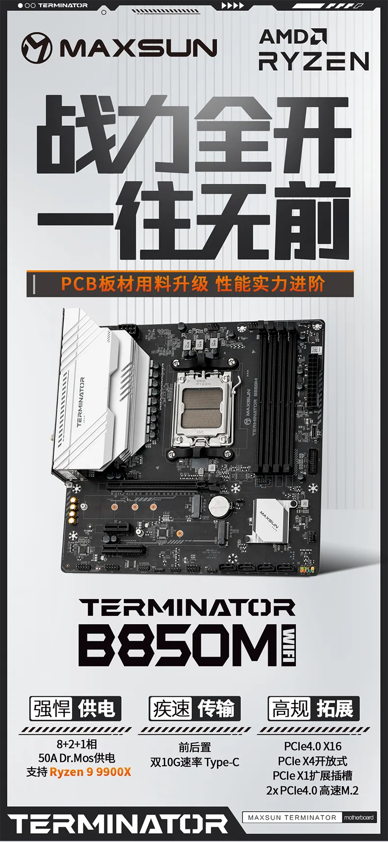MS-Terminator B850M WIFI,延續終結者系列的利落風格,提供8+2+1相50A Dr.Mos供電,配合SMT貼片電容與4顆聚合物鉭電容加持,用料十足,滿足各種高性能CPU供電需求。前后配備雙10G Type-C接口,豐富的拓展接口滿足各種連接需求。