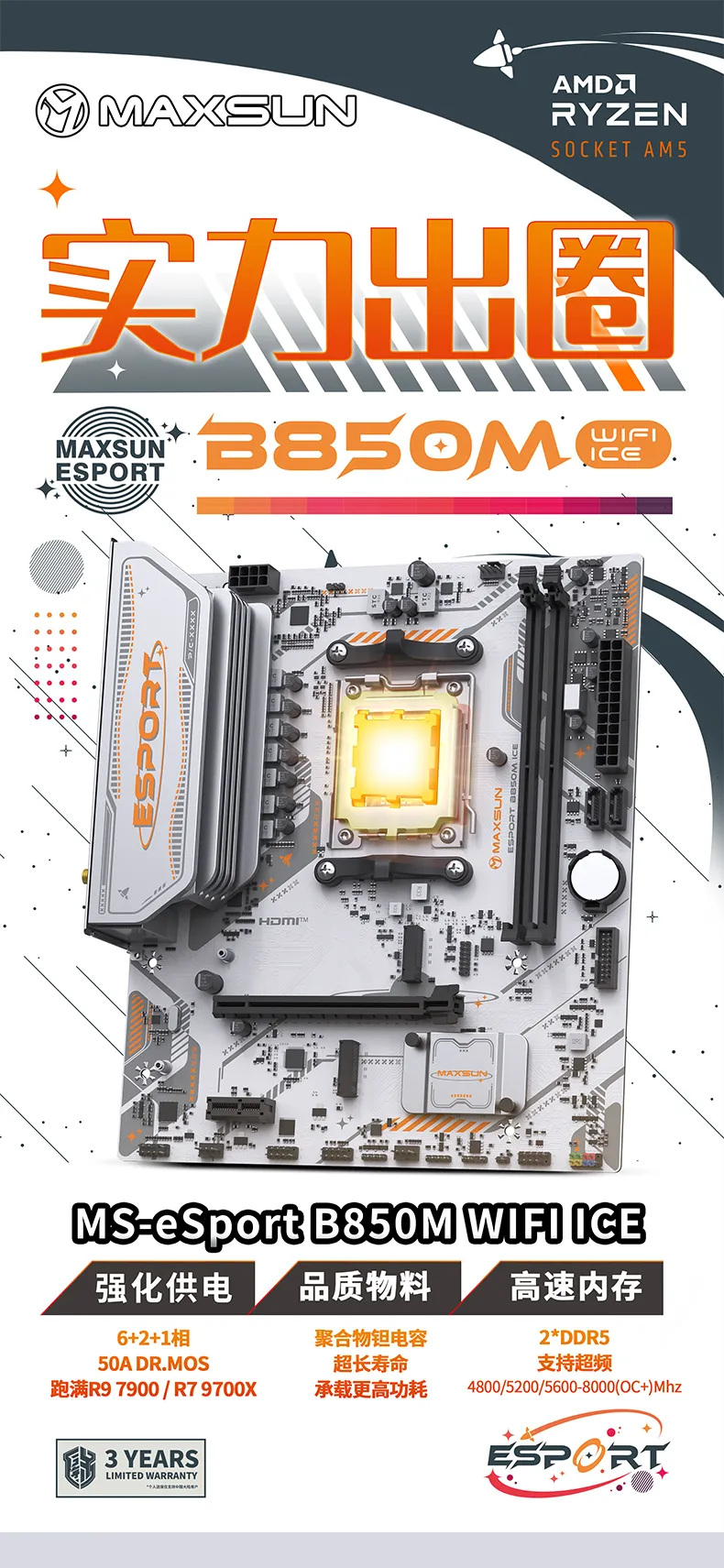 MS-eSport B850M WIFI ICE,太空主題外觀,詮釋電競美學,提供6+2+1相50A Dr.Mos供電,高效穩定,配備的2個DIMM高速DDR5內存槽,經過優化后超頻最高可達8000MHz+,進一步提升性能。拓展方面,提供2*PCIe4.0高速M.2和2*PCIe拓展插槽,滿足不同用戶需求。