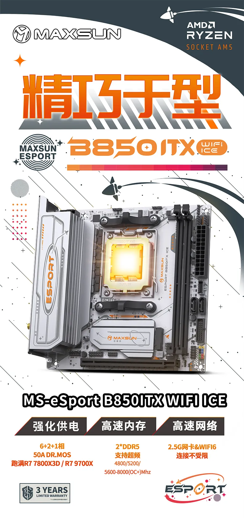 MS-eSport B850ITX WIFI ICE,特別為想要組建迷你主機的硬核玩家打造,ITX版型,精巧于型,6+2+1相50A Dr.Mos供電,穩定釋放性能,超頻能力同樣高達8000MHz+,配備2.5G有線網卡和WIFI6無線網卡,帶來又快又穩的網絡連接體驗。