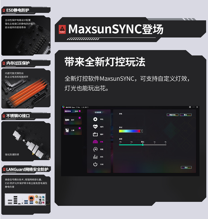 除此之外,貼心設(shè)計(jì)讓裝機(jī)與使用更省心。主板內(nèi)置了Debug自檢燈,遇到故障一鍵排查;一鍵重置CMOS按鍵,哪怕是新手裝機(jī),遇到問題也能快速排查,裝機(jī)過程更順暢;全新燈控軟件 MAXSUN SYNC 更是顏值加分項(xiàng),支持多種自定義燈效模式,打造專屬電競(jìng)氛圍,讓主機(jī)不僅是性能利器,更是桌面顏值擔(dān)當(dāng)。​