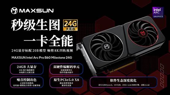 無論是追求秒級生圖、流暢剪輯的內容創(chuàng)作者,還是追求更強悍AI性能、需要搭建多卡同步運算環(huán)境的高階算力用戶,銘瑄 Intel Arc Pro B60系列顯卡都提供了值得信賴的解決方案。24G版本的MAXSUN Intel Arc Pro B60 Milestone 24G顯卡以高性價比助力靈感實時落地,雙GPU 48G版本的MAXSUN Intel Arc Pro B60 Dual 48G Turbo則以雙芯充沛算力勝任更高階的AI推理與開發(fā)任務。想要體驗全新流暢創(chuàng)作之旅,或構建本地AI算力平臺的用戶,歡迎前往銘瑄京東自營旗艦店了解更多詳情與選購!