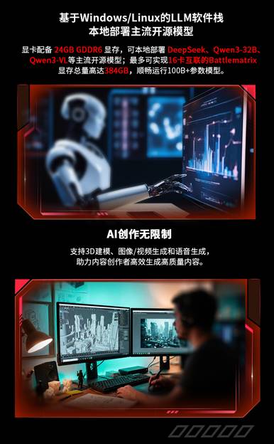 該卡創(chuàng)新采用雙GPU設計,配備48GB GDDR6超大顯存,支持多種主流大模型部署,包括DeepSeek-r1:70B蒸餾量化版、Qwen3-32B、Qwen3-VL、Qwen3-Coder-30B等,并原生支持Pytorch、ISV支持、IPEX-LLM推理引擎、適配vLLM,滿足不同場景下的高性能運算需求。