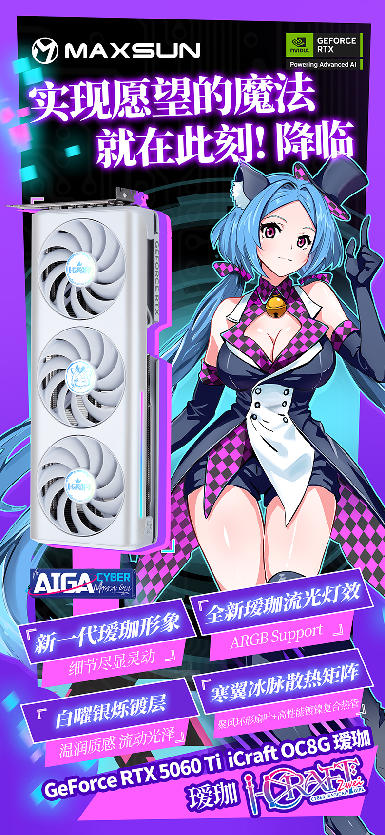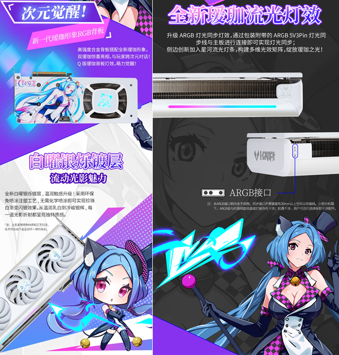 不僅性能能打,銘瑄GeForce RTX 5060 Ti iCraft OC8G 璦珈顯卡的顏值更是戳中玩家審美。全新白曜銀爍鍍層,溫潤觸感升級,采用環(huán)保免噴涂注塑工藝,無需化學(xué)噴涂就能呈現(xiàn)珍珠白漸變閃銀效果,從溫潤乳白到冷峻銀輝,每一道光影折射都獨(dú)具質(zhì)感。搭配側(cè)邊創(chuàng)新加入的星河流光燈條,構(gòu)建出多維光效矩陣,配合升級的 ARGB 燈光同步功能,只需通過包裝附帶的 ARGB 5V 3Pin 燈光同步線與主板連接,就能實(shí)現(xiàn)燈光聯(lián)動,讓主機(jī)機(jī)箱瞬間變身 "次元舞臺"。高強(qiáng)度合金背板暗藏巧思,全新Q版璦珈形象涂裝萌趣十足,與正面白調(diào)形成呼應(yīng),個性化拉滿。