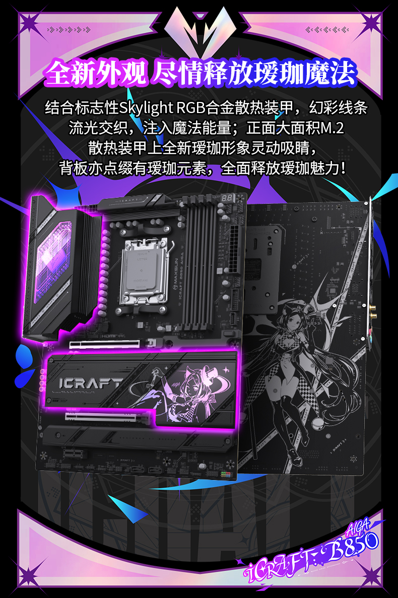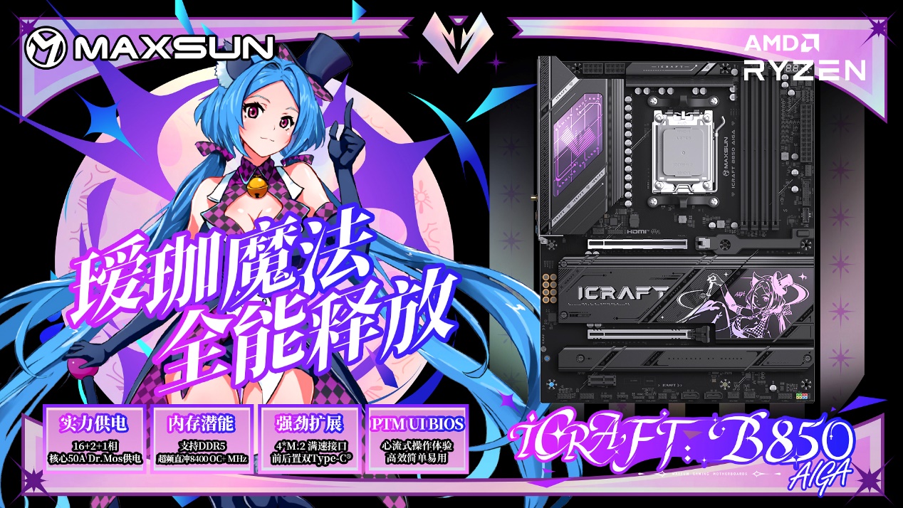 如果說AMD銳龍 7 9850X3D 處理器是性能核心,那銘瑄iCraft B850 AIGA主板就是為其量身定制的 “魔法戰(zhàn)甲”。它將二次元美學(xué)與旗艦級硬件規(guī)格深度融合,讓裝機(jī)不僅性能強(qiáng)悍,顏值更是賞心悅目,成為顏值黨與硬核玩家共同追捧的心頭好。