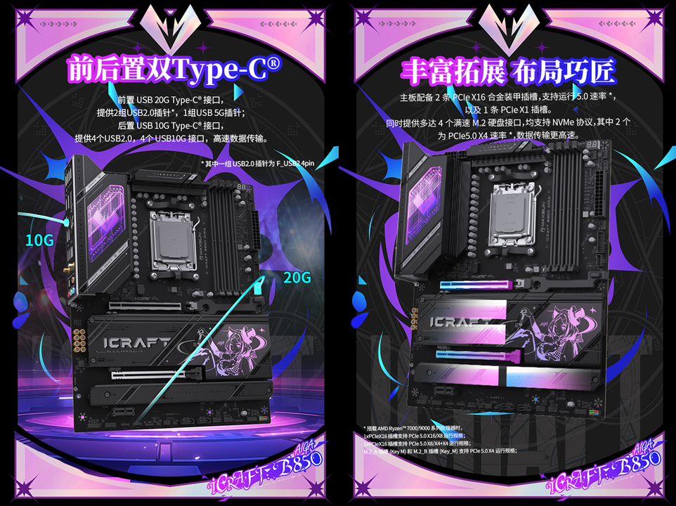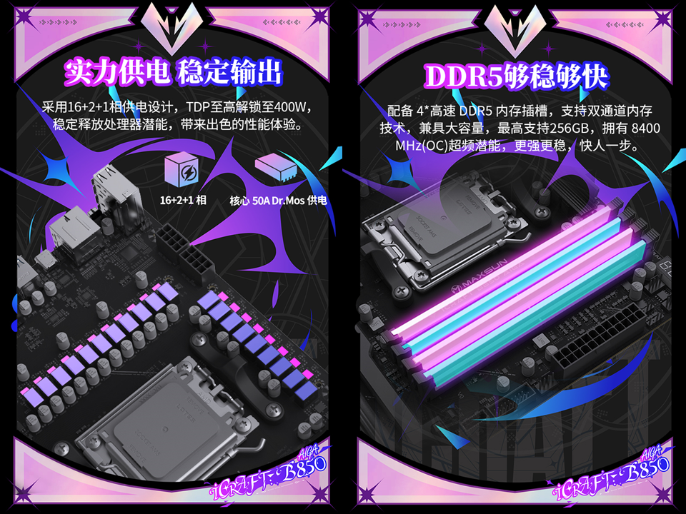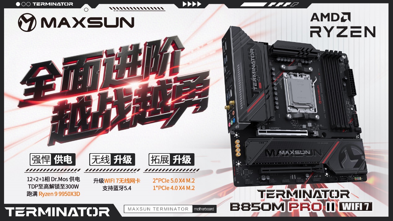 作為 AMD的核心合作伙伴,銘瑄 AM5 全系列主板全面支持AMD銳龍 7 9850X3D 處理器,助力玩家暢玩游戲,續(xù)寫性能傳奇。在眾多優(yōu)秀產(chǎn)品中,銘瑄iCraft B850 AIGA 與 銘瑄Terminator B850M PRO II WIFI7 兩款明星主板格外引人注目。它們分別以二次元顏值旗艦與高性價(jià)比戰(zhàn)力標(biāo)桿的鮮明定位,為不同需求的玩家量身打造適配 AMD 銳龍 7 9850X3D 處理器的黃金方案,讓每一分性能潛力都能盡情釋放。