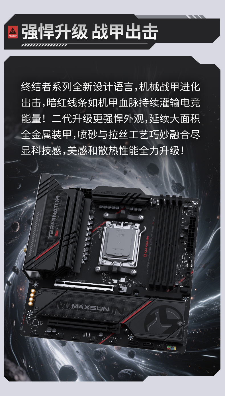 銘瑄Terminator B850M PRO II WIFI7 主板的外觀設(shè)計(jì)延續(xù)了終結(jié)者系列的硬核風(fēng)格,機(jī)械戰(zhàn)甲般的散熱裝甲上,暗紅線條如機(jī)甲能量脈絡(luò)貫穿始終,大面積全金屬裝甲融合噴砂與拉絲工藝,既增強(qiáng)了散熱性能,又帶來具有沖擊力的視覺科技感,無論放入任何機(jī)箱中都能成為焦點(diǎn)。