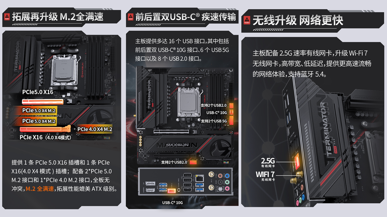 該主板在拓展和網(wǎng)絡(luò)方面還進(jìn)行了升級,主板提供2 個(gè) PCIe 5.0 X4 M.2 接口與 1 個(gè) PCIe 4.0 X4 M.2 接口,全部支持 NVMe 協(xié)議,實(shí)現(xiàn)M.2全滿速傳輸。同時(shí)配備1 條 PCIe 5.0 X16 插槽與 1 條 PCIe X16(4.0 X4 模式)插槽的配置,全板無沖突,拓展性能媲美 ATX 級別,能輕松滿足多設(shè)備連接、多場景使用的需求。網(wǎng)絡(luò)體驗(yàn)迎來跨越式升級,原生搭載的 Wi-Fi 7 無線網(wǎng)卡配合 Realtek RTL8125D 2.5G 高速有線網(wǎng)卡,支持藍(lán)牙 5.4,高帶寬、低延遲的網(wǎng)絡(luò)傳輸,讓AMD銳龍 7 9850X3D 處理器在在線游戲、高清直播、高速下載等場景中都能流暢無憂,盡情發(fā)揮性能。