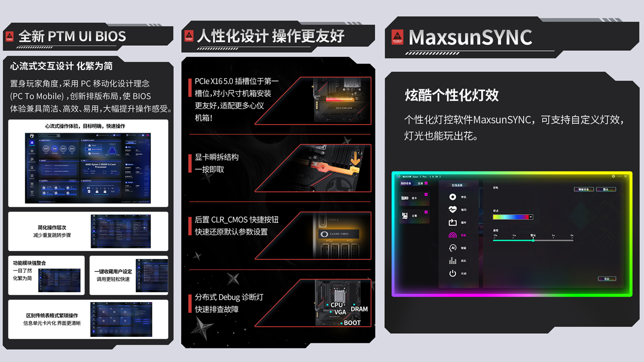 操作便捷性上,銘瑄 Terminator B850M PRO II WIFI7 主板同樣下足了功夫。全新的 PTM UI BIOS 打破傳統(tǒng)操作門檻,采用手機(jī)端般的卡片式界面設(shè)計(jì),所有交互層級不超過 2 層,新手也能輕松上手調(diào)校系統(tǒng),快速優(yōu)化AMD銳龍 7 9850X3D 處理器的運(yùn)行狀態(tài);而顯卡瞬拆結(jié)構(gòu)、分布式 Debug 診斷燈和 CLR_CMOS 快捷按鈕等貼心設(shè)計(jì),讓裝機(jī)過程更簡單,故障排查更高效,大大降低了使用門檻。此外,個(gè)性化燈控軟件 MaxsunSYNC 可支持自定義燈效,單色、音樂律動(dòng)等多種模式隨心選擇,讓燈光也能玩出獨(dú)特個(gè)性,滿足玩家的個(gè)性化需求。