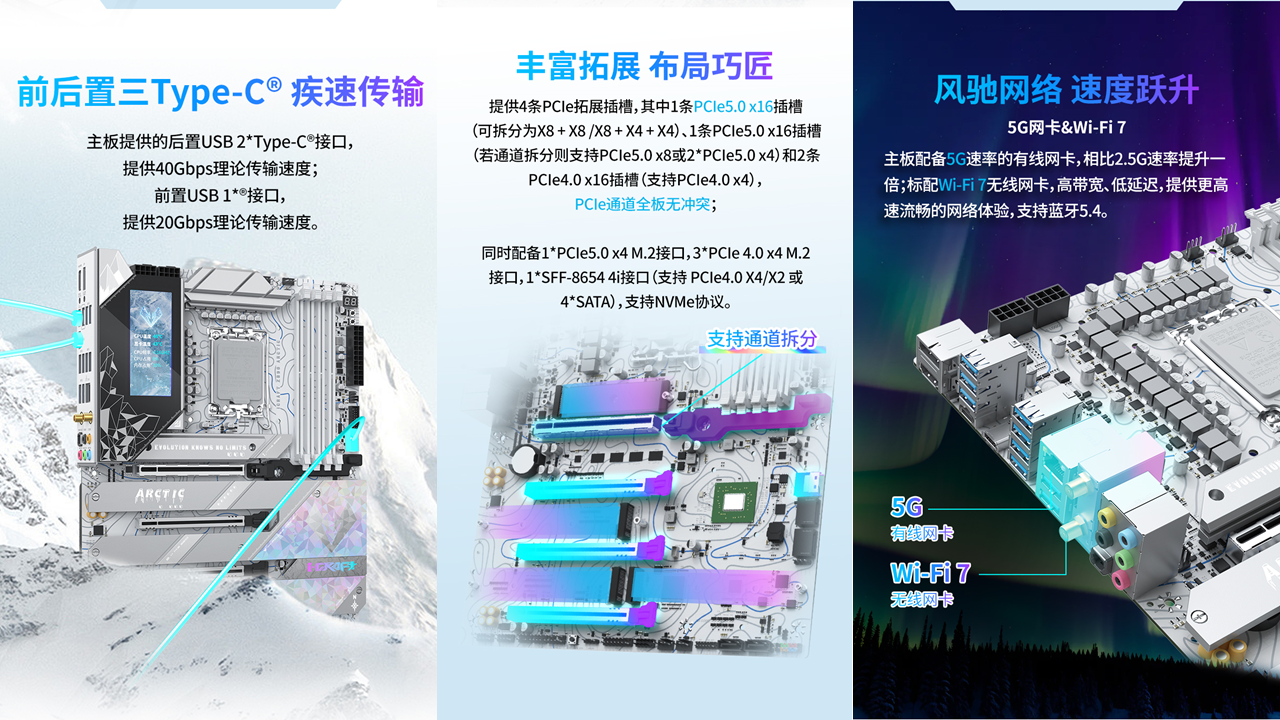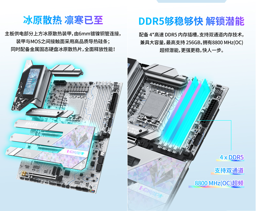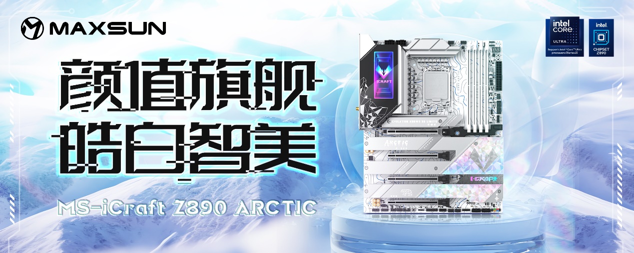 而要讓這顆 “強芯” 充分釋放潛能,離不開一塊實力與顏值兼備的主板 —— 銘瑄 iCraft Z890 Arctic 正是這樣的存在。這款主板作為iCraft系列的高端型號,以 “北冰洋” 為設計靈感,采用冰原美學設計。特殊的鈦冰晶圖案搭配炫彩元素,整體色調統一且富有質感,擺在機箱中宛如一件冰雕藝術品,完美適配當下流行的白色主機風格,擺放在機箱中,瞬間提升整機顏值。