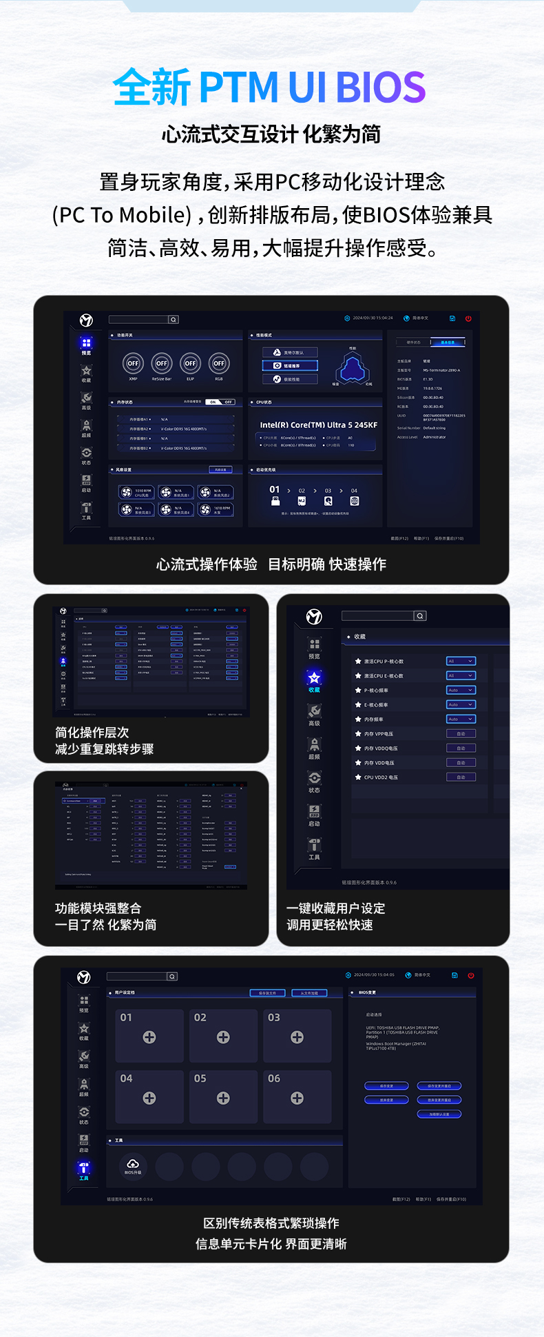 值得一提的是,銘瑄iCraft Z890 Arctic主板的 BIOS 界面全面升級為 PTM UI BIOS。借鑒手機 APP 的交互邏輯,采用模塊化設計,交互層級不超過 2 層,手機端風格的卡片式界面,讓復雜的 BIOS 設置變得簡單易懂,即使是新手玩家也能輕松上手。