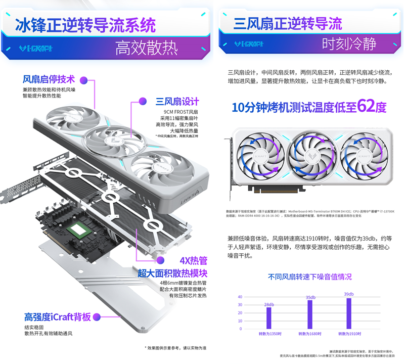 針對游戲的高負載場景,這款顯卡采用創新的正逆轉導流散熱系統,三風扇相鄰旋轉方向不同,顯著減少氣流干擾并提升進風效率,讓溫度更低,噪音控制表現更好。在10分鐘Time Spy烤機測試中,MAXSUN Intel Arc B580 iCraft 12G顯卡溫度僅為62℃,以游刃有余的冷靜表現,守護每一分性能的穩定輸出。