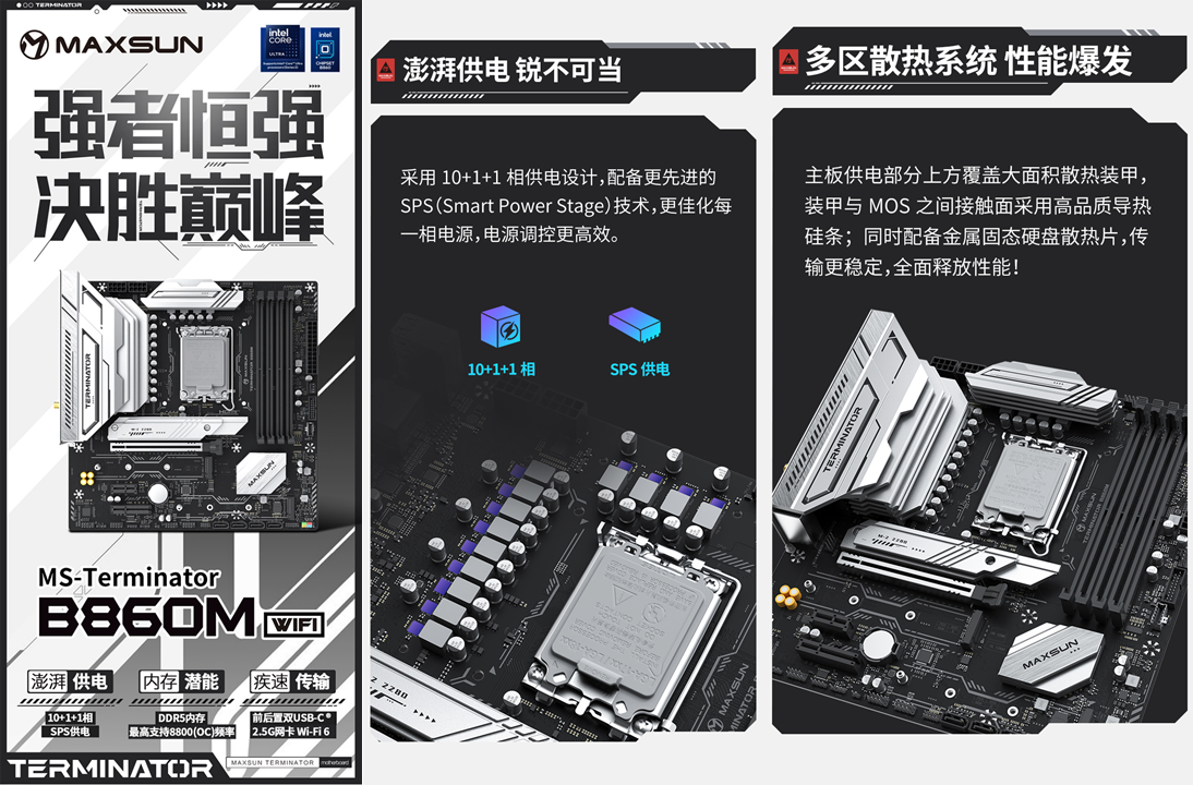 好馬配好鞍,想要充分釋放處理器的性能,一塊適配且性能強悍的主板必不可少。銘瑄Terminator B860M WIFI主板采用Micro-ATX板型,外觀上延續了終結者系列的經典撞色設計,黑色PCB搭配銀白色散熱裝甲,低調中透著滿滿的科技感,質感十足。供電方面這款主板也是誠意滿滿,采用了10+1+1 相 SPS 供電設計,配備更先進的 SPS(Smart Power Stage)技術,更佳化每一相電源,使得電源調控更加高效穩定,穩定支持英特爾酷睿 Ultra 5 225F 處理器。即使處理器處于滿負載運行狀態,也能持續輸出穩定電力,避免卡頓掉幀等問題。為了讓供電系統時刻保持冷靜,主板供電部分上方覆蓋大面積散熱裝甲,裝甲與 MOS之間接觸面采用高品質導熱硅條,能快速傳導并散發運行時產生的熱量;同時還配備金屬固態硬盤散熱片, 讓硬件性能全面釋放,傳輸更穩定。