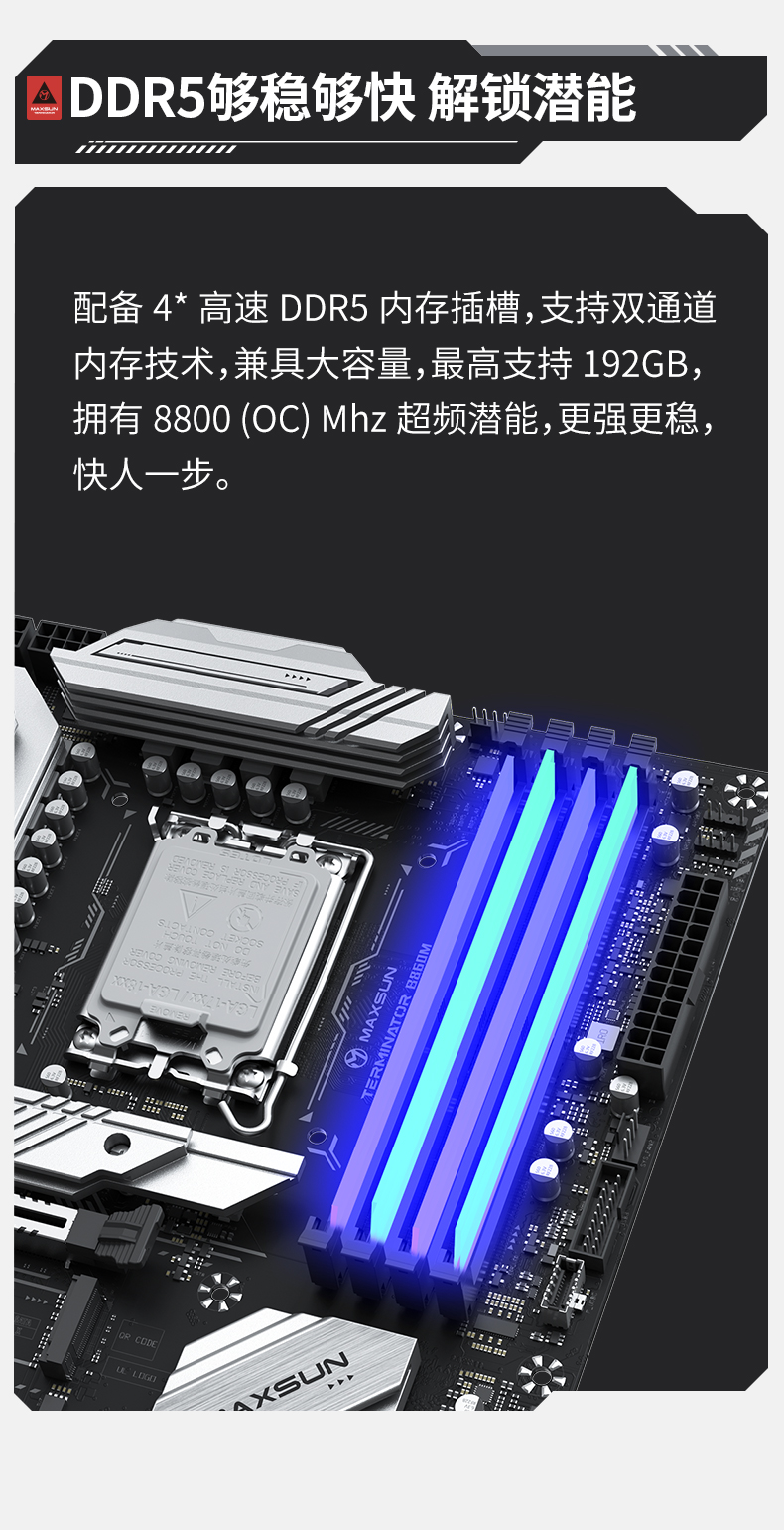 內存方面,這款主板同樣能打。它配備4條高速DDR5內存插槽,支持雙通道內存技術,兼具大容量,最高支持192GB,擁有8800 MHz(OC)超頻潛能,更強更穩。再加上英特爾酷睿 Ultra 5 225F處理器對CUDIMM內存的支持,更為沖擊高內存頻率提供了可能。對于游戲玩家和追求高性能的用戶來說,高頻內存能夠有效提升系統的數據讀寫速度,減少游戲加載時間,提升多任務處理能力,快人一步搶占先機。
