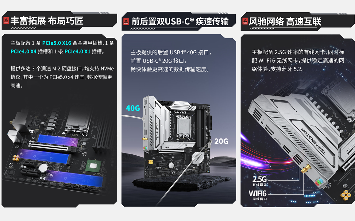 拓展性方面,銘瑄Terminator B860M WIFI主板堪稱 “全能選手”, 接口豐富且實用。 它配備 1 條 PCIe5.0 X16 合金裝甲插槽,有效防止因顯卡過重導致的插槽變形,給顯卡穩穩的支撐;同時還搭載 1 條 PCIe4.0 X4 插槽和 1 條 PCIe4.0 X1 插槽,可靈活連接萬兆網卡、擴展卡等外設。存儲接口同樣充裕,提供 3 個滿速 M.2 硬盤接口,均支持 NVMe 協議,其中 1 個更是支持 PCIe5.0 x4 速率,海量存儲輕松擴容,數據傳輸高速高效。后置 USB4 40G 接口與前置 USB-C 20G 接口的搭配,讓數據傳輸速度再上一個臺階,暢快體驗無需等待。網絡體驗也不拉胯!主板配備 2.5G 速率有線網卡和 Wi-Fi 6 無線網卡,同時支持藍牙 5.2,有線、無線雙模式自由選擇,無需額外升級。無論是有線連接的穩定高速,還是無線連接的便捷靈活,都能有效避免網絡卡頓和延遲,不管是沉浸式游戲娛樂,還是高效遠程辦公,都能輕松應對。