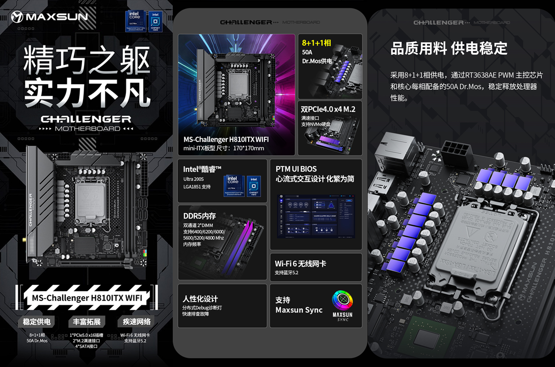 想要發(fā)揮處理器性能、連接各類硬件,一款適配性強(qiáng)、功能全面的主板至關(guān)重要。銘瑄Challenger H810ITX WIFI主板專為緊湊型主機(jī)設(shè)計(jì),17cm×17cm的標(biāo)準(zhǔn)ITX 版型,能輕松裝入市面上絕大多數(shù)迷你機(jī)箱,同時(shí)在供電、拓展、穩(wěn)定性上毫不妥協(xié),堪稱“小而全”的典范。這款主板采用8+1+1相供電設(shè)計(jì),搭配RT3638AE PWM主控芯片與每相 50A Dr.Mos ,供電電流穩(wěn)定且供電能力充足。即便處理器處于高負(fù)載運(yùn)行狀態(tài),也能持續(xù)提供穩(wěn)定電力,避免因供電不足導(dǎo)致的性能波動(dòng),能充分釋放英特爾酷睿Ultra 5 230F處理器的性能。