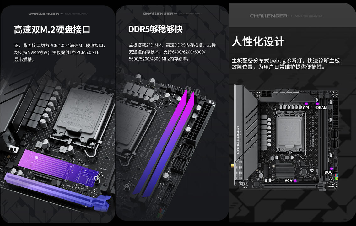 雖為迷你版型,但這款主板的拓展能力絲毫沒(méi)有“縮水”。存儲(chǔ)方面,正、背面各配備1個(gè)PCle 4.0×4滿速 M.2 接口,均支持NVMe協(xié)議,主板還提供1條PCle 5.0×16顯卡插槽;內(nèi)存方面,搭載2條DDR5內(nèi)存插槽,支持雙通道技術(shù),兼容4800/5200/5600/6000/6200/6400MHz主流內(nèi)存頻率,最大支持96GB容量,用戶可根據(jù)需求靈活升級(jí)。且主板內(nèi)置 WIFI 6 無(wú)線網(wǎng)卡與藍(lán)牙5.2模塊,WIFI 6支持更高的傳輸速率與更多設(shè)備連接,即便沒(méi)有網(wǎng)線,也能享受穩(wěn)定流暢的網(wǎng)絡(luò);藍(lán)牙5.2則方便連接無(wú)線鼠標(biāo)、鍵盤、耳機(jī)等外設(shè),減少桌面線材雜亂。此外,主板還提供4個(gè)SATA接口與12個(gè)USB接口,無(wú)論是連接機(jī)械硬盤、外接硬盤,還是接入U(xiǎn)盤、打印機(jī)等外設(shè),都能滿足需求。