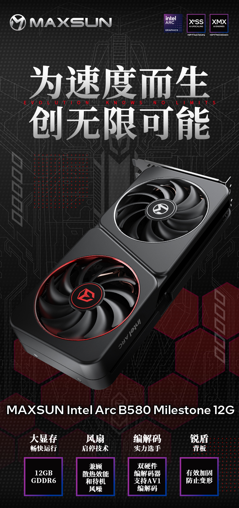 如果說(shuō)處理器與主板決定了主機(jī)的基礎(chǔ)性能,那么顯卡就是暢玩3A游戲大作的關(guān)鍵。MAXSUN Intel Arc B580 Milestone 12G 顯卡,不僅擁有強(qiáng)悍的圖形性能,還在外觀設(shè)計(jì)與散熱表現(xiàn)上精心打磨,并且支持英特爾即將上線的XeSS 3多幀生成技術(shù),實(shí)現(xiàn)幀率跨越式提升,高度適配緊湊型主機(jī)的使用需求。