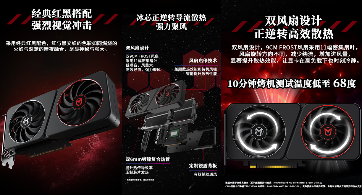 這款顯卡外觀設(shè)計(jì)上經(jīng)典紅黑配色很具視覺(jué)沖擊力,紅與黑交織如同火焰撞入暗夜,神秘又霸氣,放在桌面就是顏值擔(dān)當(dāng)。核心性能更是硬核,20 個(gè) Xe 內(nèi)核搭配 2850MHz 超高加速頻率,無(wú)論是 3A 游戲的高負(fù)載場(chǎng)景,還是專業(yè)創(chuàng)作的算力需求,都能流暢響應(yīng);12GB GDDR6 大顯存 + 456GB/S 高速帶寬,數(shù)據(jù)傳輸無(wú)瓶頸,復(fù)雜多任務(wù)處理也游刃有余。散熱與實(shí)用功能雙在線:雙 9CM FROST 正逆轉(zhuǎn)風(fēng)扇搭配 11 幅密集扇葉,減少繞流、提升進(jìn)風(fēng)量,配合雙 6mm 鍍鎳復(fù)合熱管與定制銳盾背板,10 分鐘烤機(jī)溫度低至 68℃,高負(fù)載下也能冷靜運(yùn)行;支持風(fēng)扇啟停技術(shù),兼顧散熱效能與待機(jī)靜音。接口配置豐富實(shí)用,3 個(gè) DP2.1+1 個(gè) HDMI2.1a 接口,多屏顯示、超高清影音、高分辨率游戲需求全覆蓋,還搭載雙硬件編解碼器,支持 AV1 格式與 Intel Deep Link 超級(jí)編碼,讓直播推流更順暢,視頻剪輯導(dǎo)出速度大幅提升,創(chuàng)作效率直接翻倍。